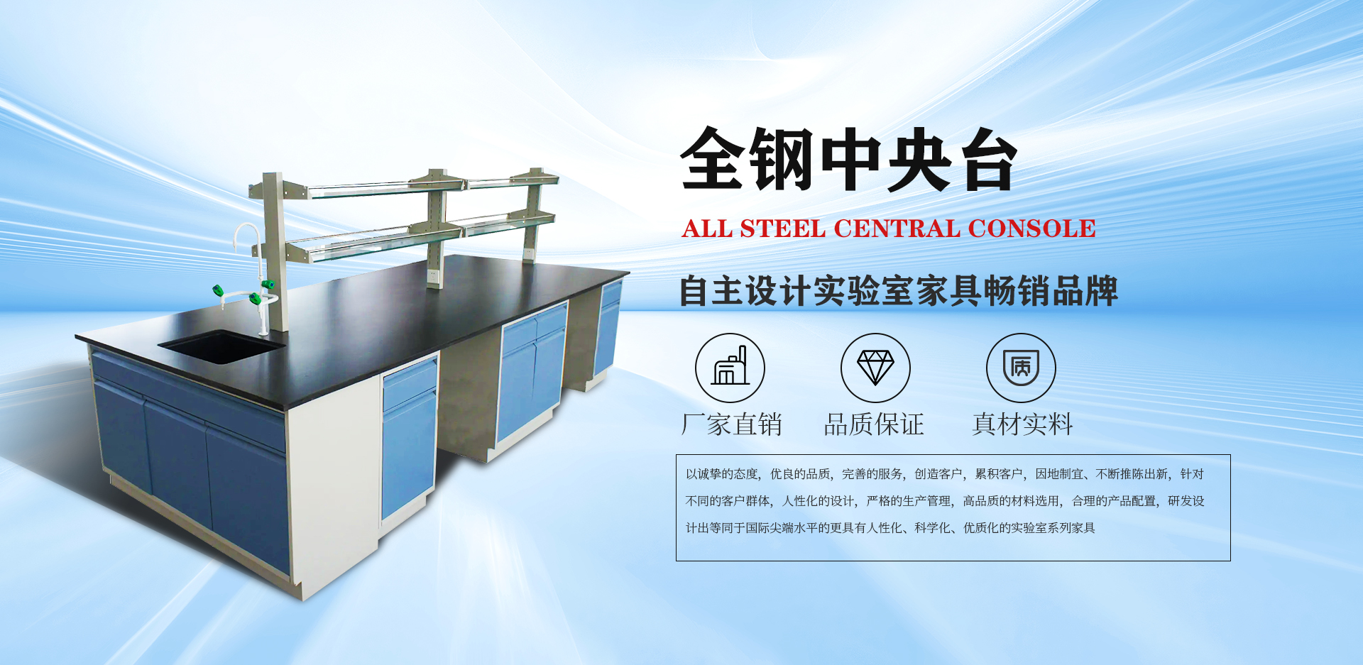 公司以誠摯的態度,優良的品質,完善的服務,創造客戶,累積客戶,因地制宜、不斷推陳出新,針對不同的客戶群體,人性化的設計,嚴格的生產管理,高品質的材料選用,合理的產品配置,研發設計出等同于國際尖端水平的更具有人性化、科學化、優質化的實驗室系列家具。